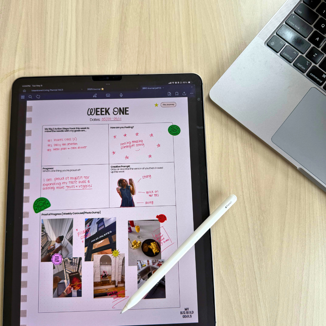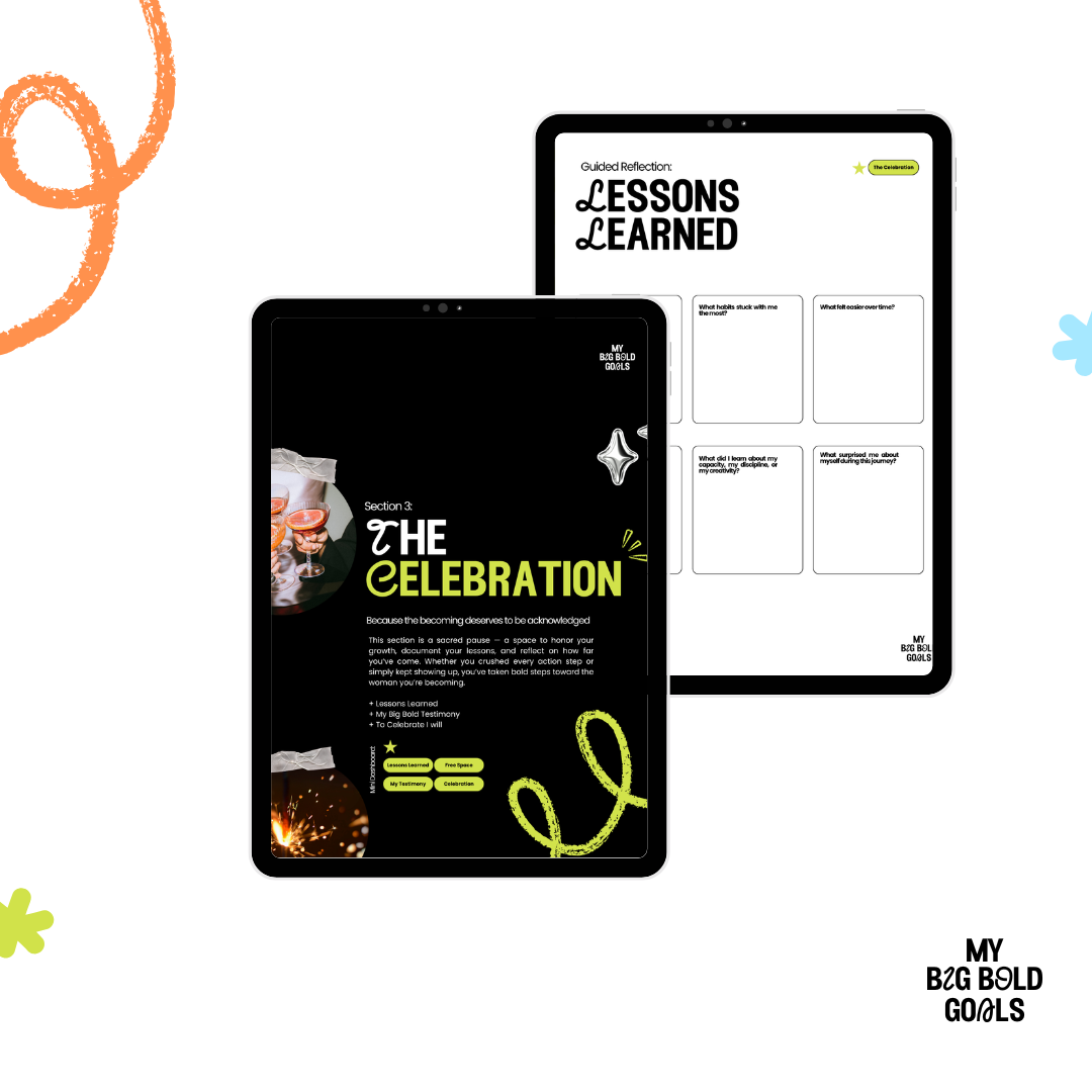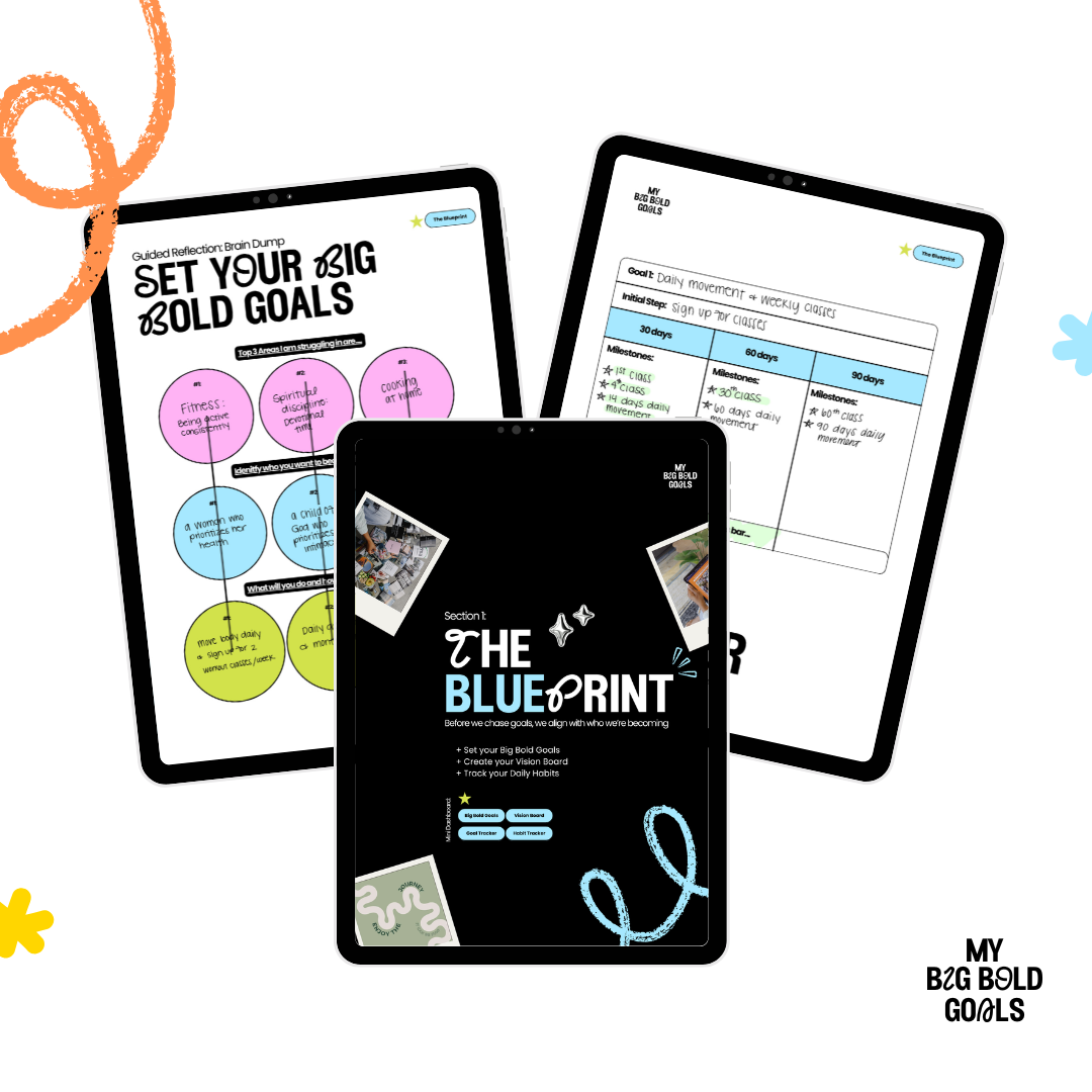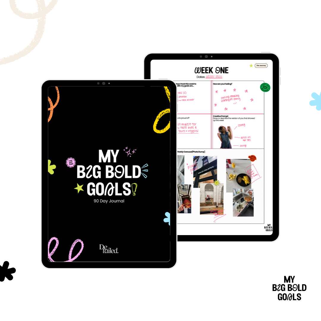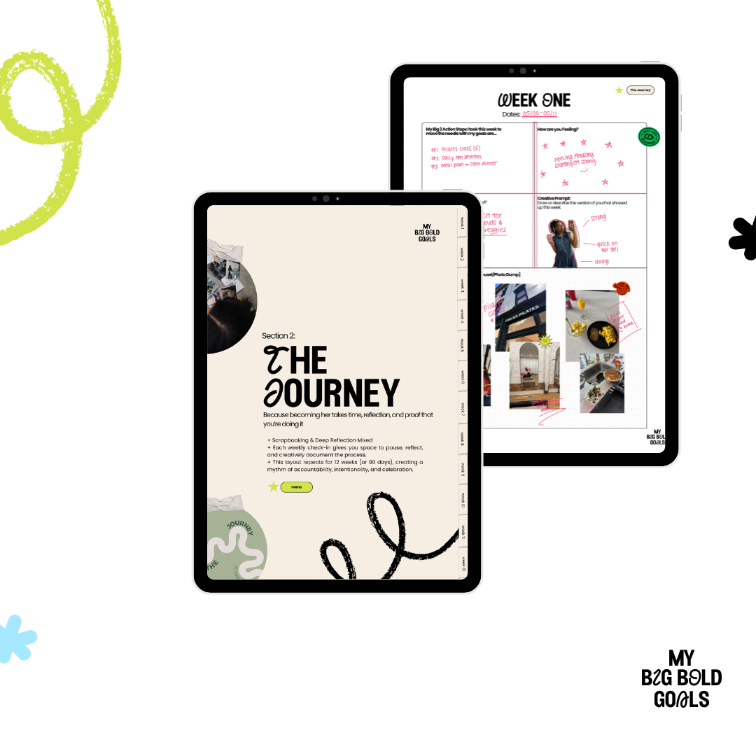 The BIG Bold Goals Journal is your creative space to track goals with intention, reflect with purpose, and document the woman you're becoming. Designed for the busy, multi-passionate woman, this 90-day journal blends identity-driven goal setting, weekly check-ins, and visual storytelling into one empowering experience.